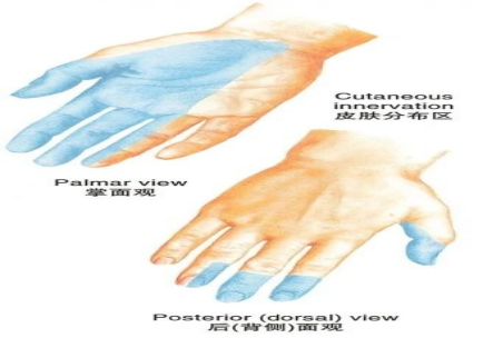 1. 受压的正中神经支配区为拇指至无名指的三指半(即拇、示、中指及环指桡侧)区域(图2)的麻木,疼痛,蚁走感,这种不适感也可达到肘、肩部,夜间或清晨症状明显,活动手腕后缓解。